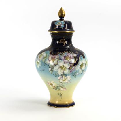 Deckelvase mit kobaltblauem Teilfond und farbiger Blumenmalerei
