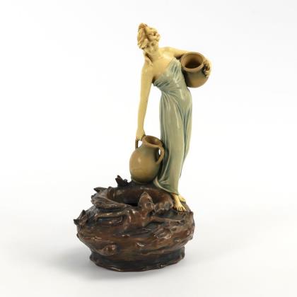 Akt einer jungen Frau, die in aparter Geste Wasser aus der Quelle schöpft