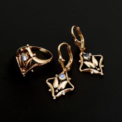 Jugendstilring und Ohrhängerpaar mit Mondsteinen