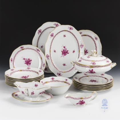 Form "Altozier". 5 Speiseteller, 7 Suppenteller, 1 Buttergießer (L 18,5 cm), 1 Sauciere, 1 Schale (Ø 24,5 cm), 1 Schüssel (Ø 20,5 cm), 1 Tablett (L 31,5 cm), 2 Ovalplatten (L 37 cm) und 1 Terrine (Ø 28,5 cm)