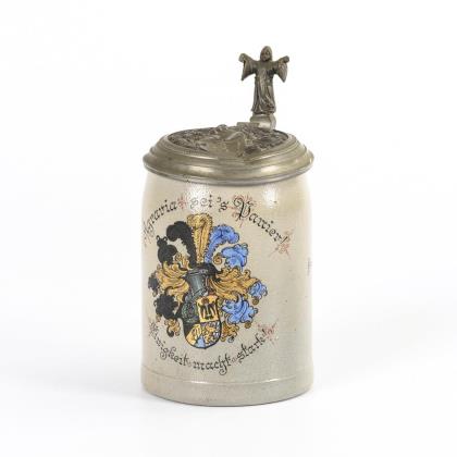 Verbindungswappen sowie Widmung von 1921/22. Zinndeckel mit Wappenrelief und Zirkel sowie Münchner-Kindl-Drücker