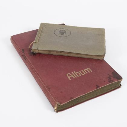 Postkartenalbum mit ca. 179 Karten vor 1945 (Rotes 'Album', 38 x 23 cm) und Fotoalbum mit ca. 37 Studentenfotos um 1920, darunter Mensur, Gedenktreffen, Männer im vollen Wichs. (Graues Pappalbum, 18 x 24 cm)