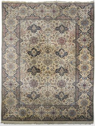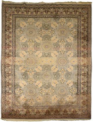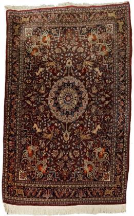 Achtgliedriges Rosettenmedaillon auf reich gemustertem Spiegel mit Vögeln, Hirschen und Raubtieren, Vasenmotiven und verschiedenartigen Blütenzweigen. Mehrreihige Bordüre mit Blumen und Tieren