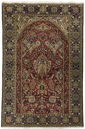Im Rapport gemustertes Mittelfeld mit großen Kreuzblüten und Rosetten in feinem Islimi- und Blumenrankendessin. Bordüre mit alternierenden Blumenvasen und Lilien. Lederverstärkte Längsseiten