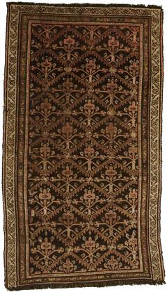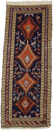 Kaukasischer Dekor mit vier gezahnt geränderten Rautenmedaillons mit hakenbesetzten Ornamenten auf nachtblauem Mittelfeld mit stilisierten Tieren, Reitern und Menschen. Dreireihige Bordüre mit Streifendekor und Kartuschendekor