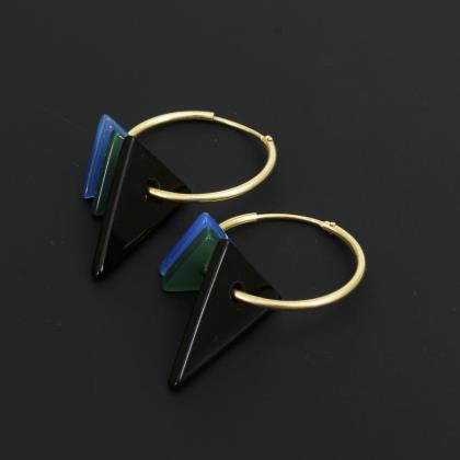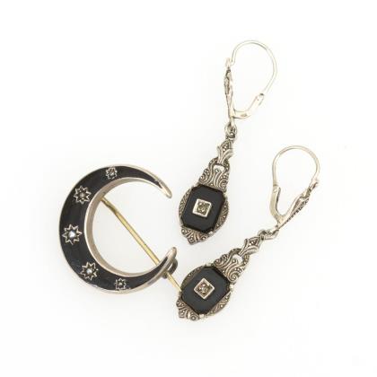 Schwarz emaillierte Brosche mit kleinen Perlchen. Hakenverschluss. Ohrhängerpaar mit Onyxeinlage. Federbügel