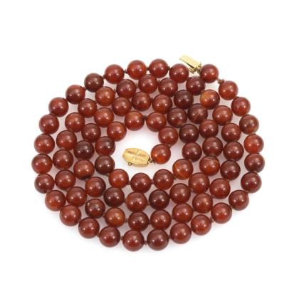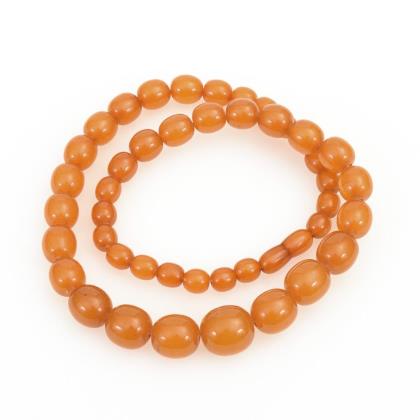 Schnürkette mit Bernsteinen im Verlauf, einzelverknotet. Ringfederschließe