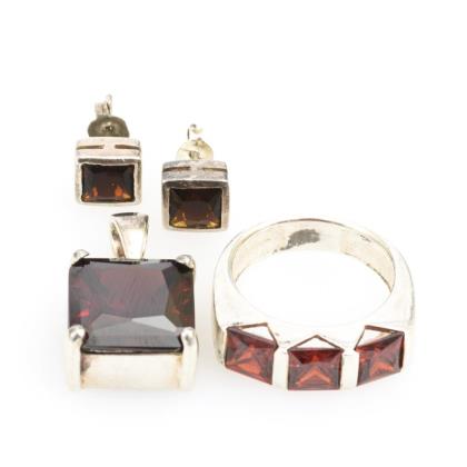 Anhänger, Ring und Ohrsteckerpaar mit Granaten in massiven Fassungen. Breite Schiene. Steckmechanik