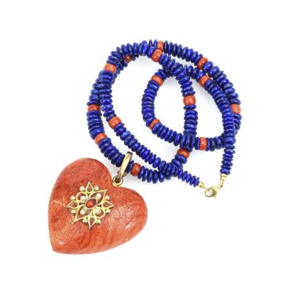 Korallenherz mit Ornamentmontierung und Klippöse, an Schnürkette mit Lapis-Scheiben. Karabinerschließe