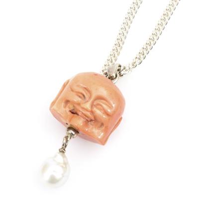 Buddha-Kopf-Anhänger Wurzelkoralle und Zuchtperle an Kette