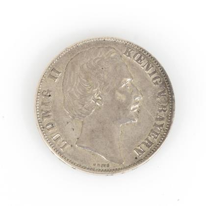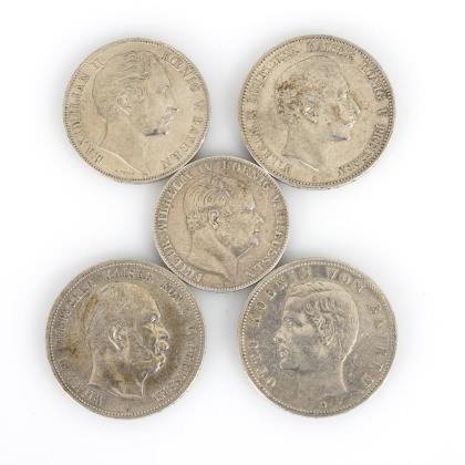 Doppelgulden "Maximilian II Koenig v. Bayern", 1855. / Vereinsthaler "Friedr. Wilhelm IV Koenig v. Preussen", 1860 / 5 Mark "Otto Koenig von Bayern", 1907. / 5 Mark "Wilhelm Deutscher Kaiser König v. Preussen", 1874. / 5 Mark "Wilhelm II Deutscher Kaiser König v. Preussen"