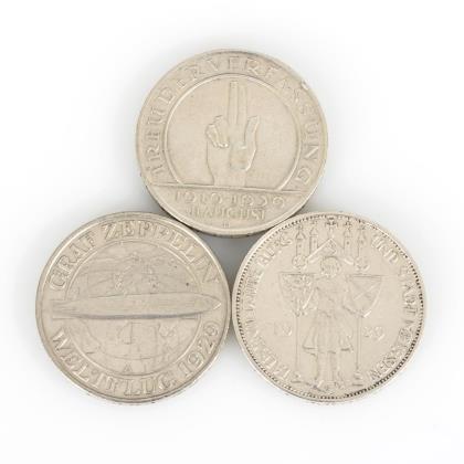 3x 3 Reichsmark: "Treu der Verfassung", 1929, Münzstätte D. / "Graf Zeppelin Weltflug", 1929. / "Tausend Jahre Burg und Stadt Meissen", 1929