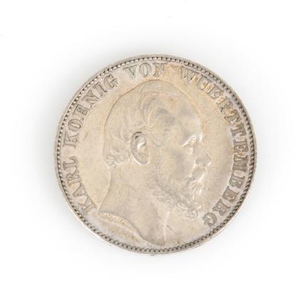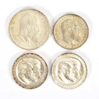 5 Mark, "Wilhelm II. Koenig von Württemberg", 1913. / 3 Mark, dito, 1912. / 2x 3 Mark, "Wilhelm II. und Charlotte von Württemberg, 1886 - 1911", 1911