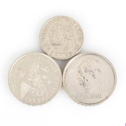 3 Reichsmark - "Goethe", 1932. / 3 Reichsmark - "Walther von der Vogelweide", 1930. / 2 Reichsmark - "Martin Luther", 1933