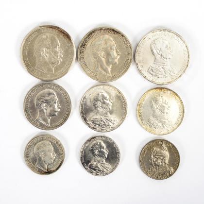 5 Mark, "Wilhelm Deutscher Kaiser König v. Preussen", 1875. / 5 Mark, "Wilhelm II. Deutscher Kaiser König v. Preussen", 1899. / 3 Mark, dito, 1908. / 2 Mark, dito, 1907. / 5 Mark, "Wilhelm Deutscher Kaiser König von Preussen", in Uniform, 1914. / 2x 3 Mark, dito, 1913 und 1914. / 2 Mark, dito, 1913. / 2 Mark, "Friedrich I. 1701 Wilhelm II. 1901", 1901