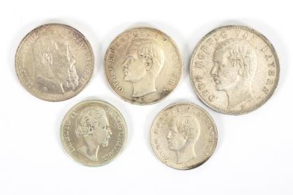 5 Mark, "Otto König von Bayern", 1903. / 3 Mark, dito, 1912. / 2 Mark, dito, 1903. / 3 Mark, "Luitpold Prinzregent v. Bayern", 1911. / 2 Mark, "Ludwig II. König v. Bayern", 1876