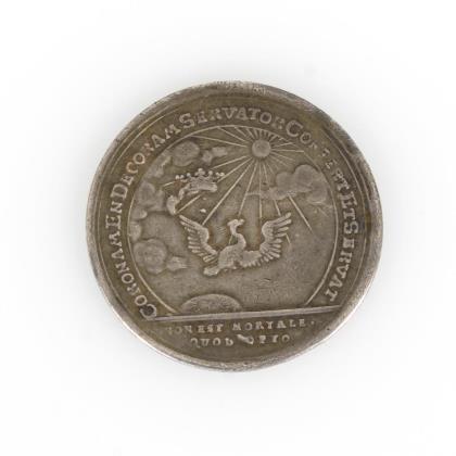Auf den Tod von Christian Ernst - Christian Ernst, vor Wegekreuz mit Insignien kniend, im Hintergrund Saalfelder Stadtansicht. "Las Dir an meiner Gnade genugen", "Iesu du Sohn David erbarme dich mein". Revers: "Adler zu Sonne auffliegend, "Coronam en decoram servator confert er servat"