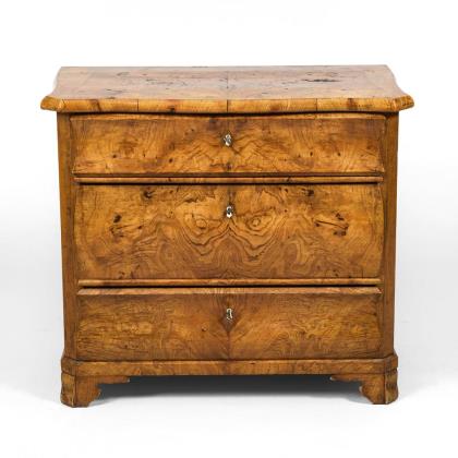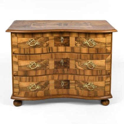 3-schübiger, stiltypisch geschwungener Korpus, verziert mit Maserfurnier und Kassettenfüllungen; Schübe mit Rocaillengriffen und bronzierten Schlüsselbeschlägen