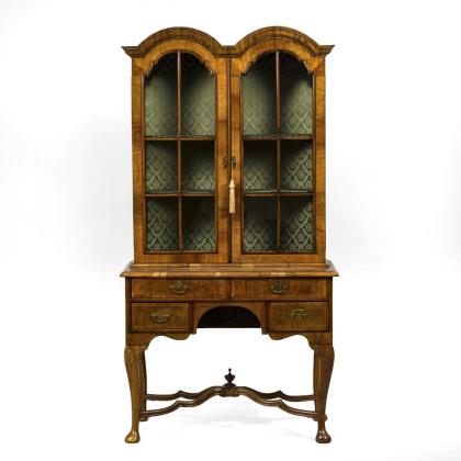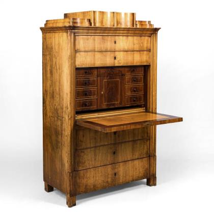 Aufsatzschrank mit 3-schübigem Unterteil auf geplätteten Kugelfüßen, 2-türiger Aufsatz mit getrepptem Giebel; verziert mit kassettiertem Maserfurnier und originalen Bügelgriffen und Schlüsselbeschlägen. Aufsatz innen mit 4 offenen Fächern, 5 kleinen Schüben im Kopfbereich und 5 weiteren Schüben im unteren Teil