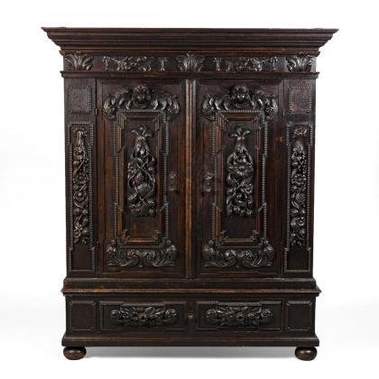 Aufwendig gestalteter 2-türiger Fassadenschrank mit Sockelschub und getrepptem Gesims, auf geplätteten Kugelfüßen; üppig verziert mit plastischem Schnitzwerk aus Puttenköpfen, Maskaronen und Akanthusblattmotiven