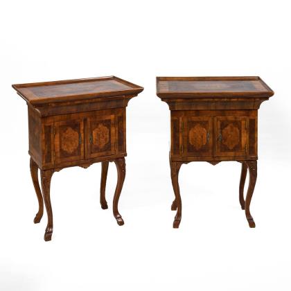 Paar zierliche Beistellschränkchen mit 2-türigem Korpus, ausgestelltem Hohlkehl-Gesims und geheimen Kopfschub, je auf 4 geschwungenen Beinen; dekoriert mit Kartuschen-Maserfurnier