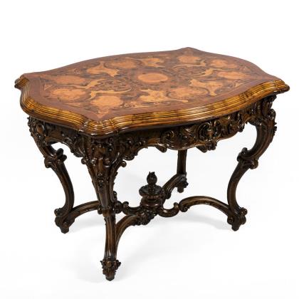Stiltypisch geschwungener Tisch mit üppigem Schnitzwerk und hohlkehlverzierter, marketierter Platte mit Puttenköpfen, Muschelwerk und Rocaillen, auf 4 geschweiften Beinen mit flammenbekrönter Kreuzverstrebung