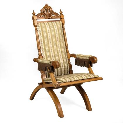 Sogenannter "Faulenzer" mit seitlichen Drechselstäben, hoher versprosster Lehne mit Kopfbrett mit Volutenschnitzerei, versprosster Sitzfläche, teilbezogenen volutierten Armlehnen und gebogten Scherenbeinen; Rücken- und Sitzauflage mit hellem Streifenbeug