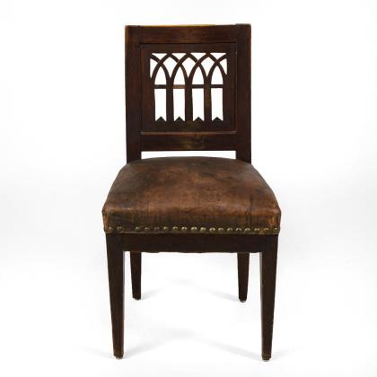 Schlichter Lehnstuhl mit gotisierenden Spitzbögen in der Rückenlehne, auf 4 Pfeilerbeinen. Jüngere Polsterung mit braunem Lederbezug und Ziernagelung