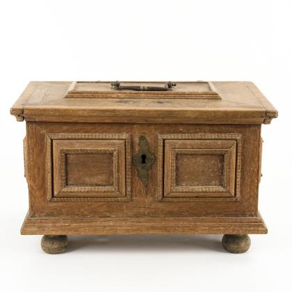 Auf Kugelfüßen stehender Quaderkorpus. An der Front, am Scharnierdeckel, an den Seiten und im Deckel aufgelegte Scheinkassetten zumeist mit Flammleisten. Messing-Schlüsselschild, Eisen-Tragegriff auf dem Deckel. Innen Beilade und originales Schloss sowie mit Marmorpapier ausgeschlagen