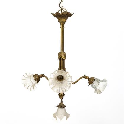 4-flammige Hängelampe an kanneliertem Bronzeschaft mit Palmettenbaldachin, 3 geschwungenen Armen und 1 Mittelschirm mit blütenförmigen Lampenschirmen