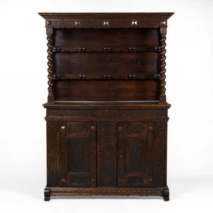 Üppig verzierter Teller- und Tassenschrank in frühbarocker Formensprache mit offenem Aufsatz, dekoriert mit seitlich vorgestellten gedrehten Säulen und reich beschnitztem Korpus mit floralem Schnitzwerk, geschnitzte Inschrift: "An Gottes Segen ist alles gelegen Anno 1767"; 1 kleiner Mittelschub