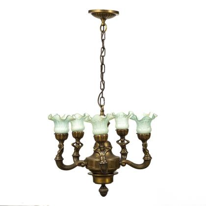 5-flammige Hängelampe mit Balusterkorpus und 5 Karyatiden-Armen mit blütenförmigen, grünlichen Lampenschirmen; an Kettenaufhängung mit Rosettenbaldachin