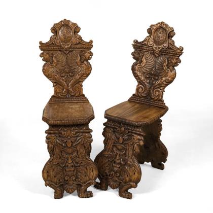 2 Fratzen-Brettstühle mit üppig beschnitzter Rückenlehne im Stil der Renaissance, auf 2 ausgestellten Stollenbrettern, vordere Frontalwangen mit reich beschnitzter Groteskenornamentik