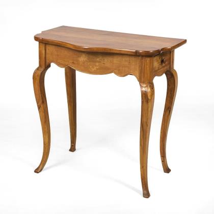 2-schübiger Beistelltisch in leicht geschwungener Form auf Baluster-Mittelstütze mit 3 geschweiften Beinen; verschließbarer Schub mit Fächerung
