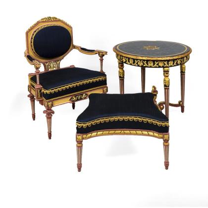 3-teilige pompöse Salongarnitur mit ausladendem Armlehnsessel, passig geformtem Hocker und rundem Tisch in stiltypisch klassizistischer Formgebung mit antikisierenden Elementen wie kannelierten Säulenbeinen, Akanthusblattvoluten, Palmetten oder Figuren der Mythologie. Extravagante Farbgebung in Rosa, Sand und Nachtblau, Polster mit nachtblauem Bezug
