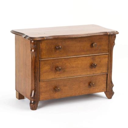 3-schübige Puppen- oder Kinderkommode in barocker Formensprache mit geschweiften Seitenleisten und geschwungener Deckplatte