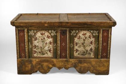 Kastentruhe in Brettbauweise mit geschweifter Zarge und schauseitiger Blumenbemalung in Grün, Rot und Weiß; innen mit Floraltapete ausgekleidet und 2 Beifächern, Deckelinnenseite mit Heiligenmotiven beklebt, dazu geklebter Beitext mit Jahreszahl "1823"