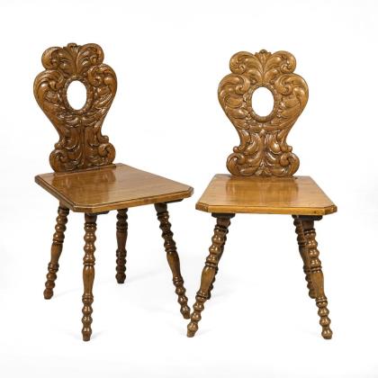2 Historismus-Brettstühle mit Groteskenschnitzerei