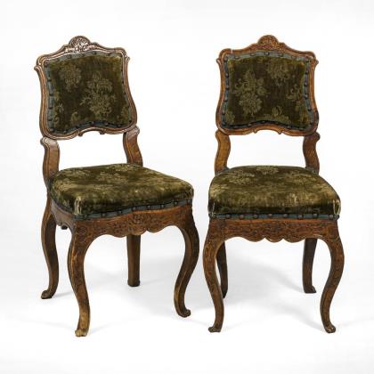 2 Polsterstühle in stiltypisch geschwungener Form, verziert mit Muschelwerk- und Beschlagwerkschnitzerei, Rückenlehne und Sitzfläche mit dunkelgrünem Samtbezug, floralem Muster und Ziernagelung
