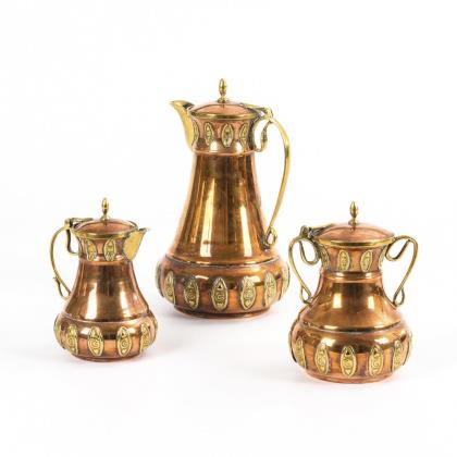 Relief-Messingauflagen an Kanne, Sahnekännchen und Zuckerdose