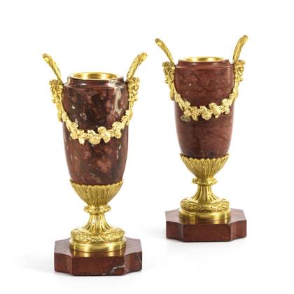 Schlanke Marmorvasen mit verziertem Bronzefuß und Blütengirlanden zwischen den Fauns-Maskarone sowie kleine Messing-Einsätze