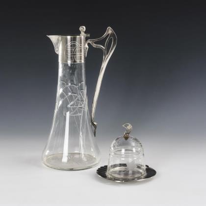 Jugendstil-Karaffe und Glasdose auf Unterteller