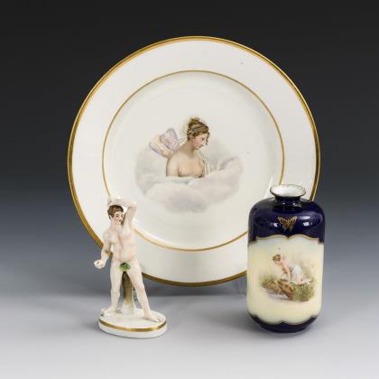 1x Nymphenburg: Teller mit der Darstellung einer aus den Wolken schauenden Elfe (Ø 21 cm). / 1x Rosenthal: Zylindervase mit kobaltblauem Teilfond und der schauseitigen Darstellung einer in das Wasser schauenden Elfe (H 11,5 cm). / 1x Neapelmarke: stehender Männerakt (H 11,5 cm)