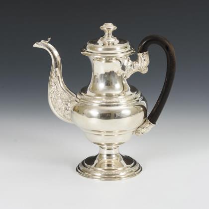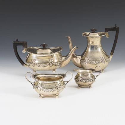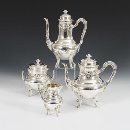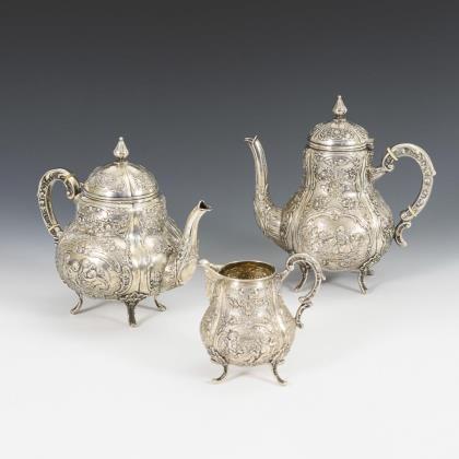 Schwere Silbergarnitur mit Floralreliefs und Puttenszenen: Kaffeekanne, Teekanne, Milchkännchen