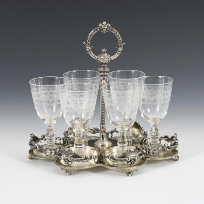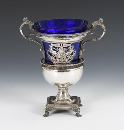 Elegant durchbrochenes Gefäß mit Siegesgöttin auf Quadriga und Tierkopfhenkeln. Seitlich Halterungen für 12 Löffel