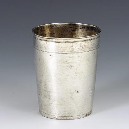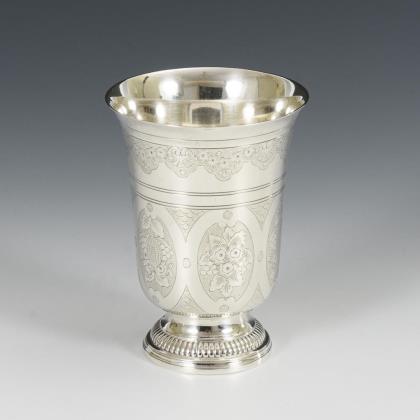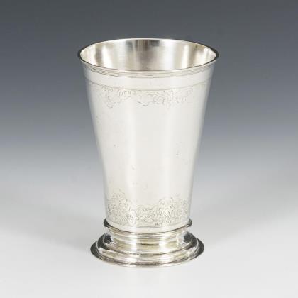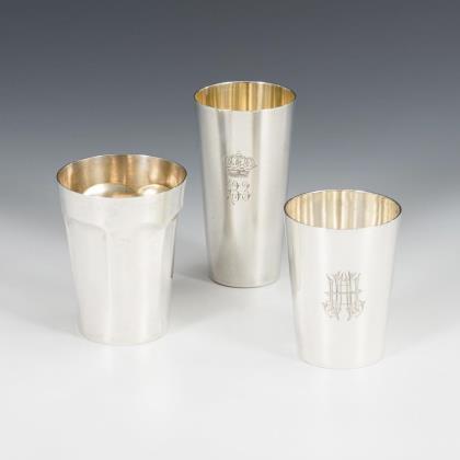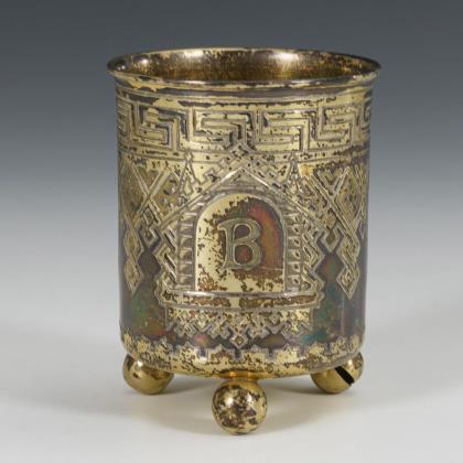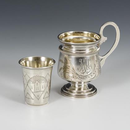 Henkelbecher mit Innenvergoldung und Monogrammgravur "MH". / Kleiner Schnapsbecher mit gravierten Architekturmotiven