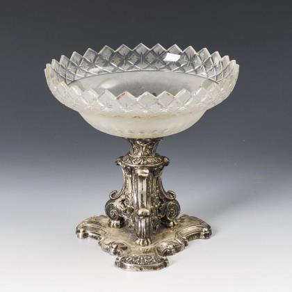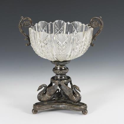 Klarglasschale mit Waffelschliff und volutenförmig eingerollten Silberhenkeln. Auf Fuß mit 3 plastischen Schwanenfiguren