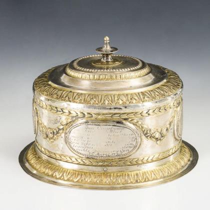 Ovale Dose mit klassizistischer Reliefzier und 4 ovalen Medaillons: 3 gravierte Szenen mit letztem Abendmahl, Auferstehung und Himmelfahrt Christi sowie Stifterinschrift in deutscher Sprache: "Diese Capsel wurde von (...) gestiftet"