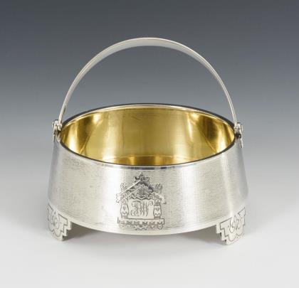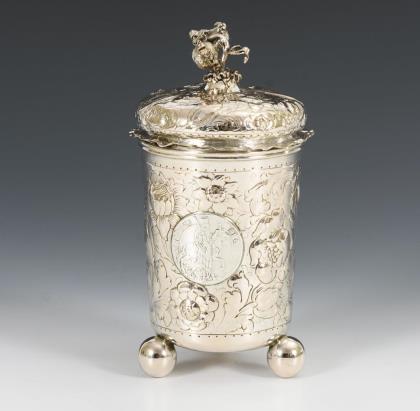 Dreifuß mit Blütenreliefs und Mäanderband. An einem Bein datiert: "3. Juli 1854". Gewölbter Deckel wohl ergänzt (ungepunzt, Silber geprüft)
