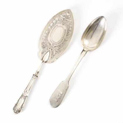 Elegante Kaffeelöffel mit vergoldeter Laffe und verschlungener Monogrammgravur "IMC". Dazu passend ergänzte kleine Aufschnittgabel. In braunem Kästchen mit defektem Scharnier